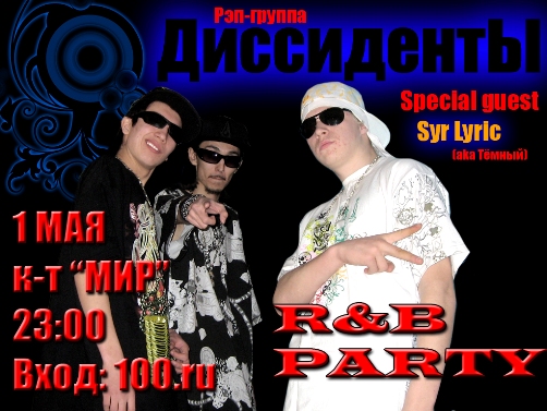 Прювед народ! Это рэп-группа ДиссидентЫ. 1 мая,на площади приходи покричать под нашу песню. А после площади в 23.00 мы ждём тебя в к-т "МИР" на RNB PARTY от гр. ДиссидентЫ,где будут ваши самые любимые песни,ремиксы,новые композиции и зажигательные танцы от очаровательных NAMELESS.